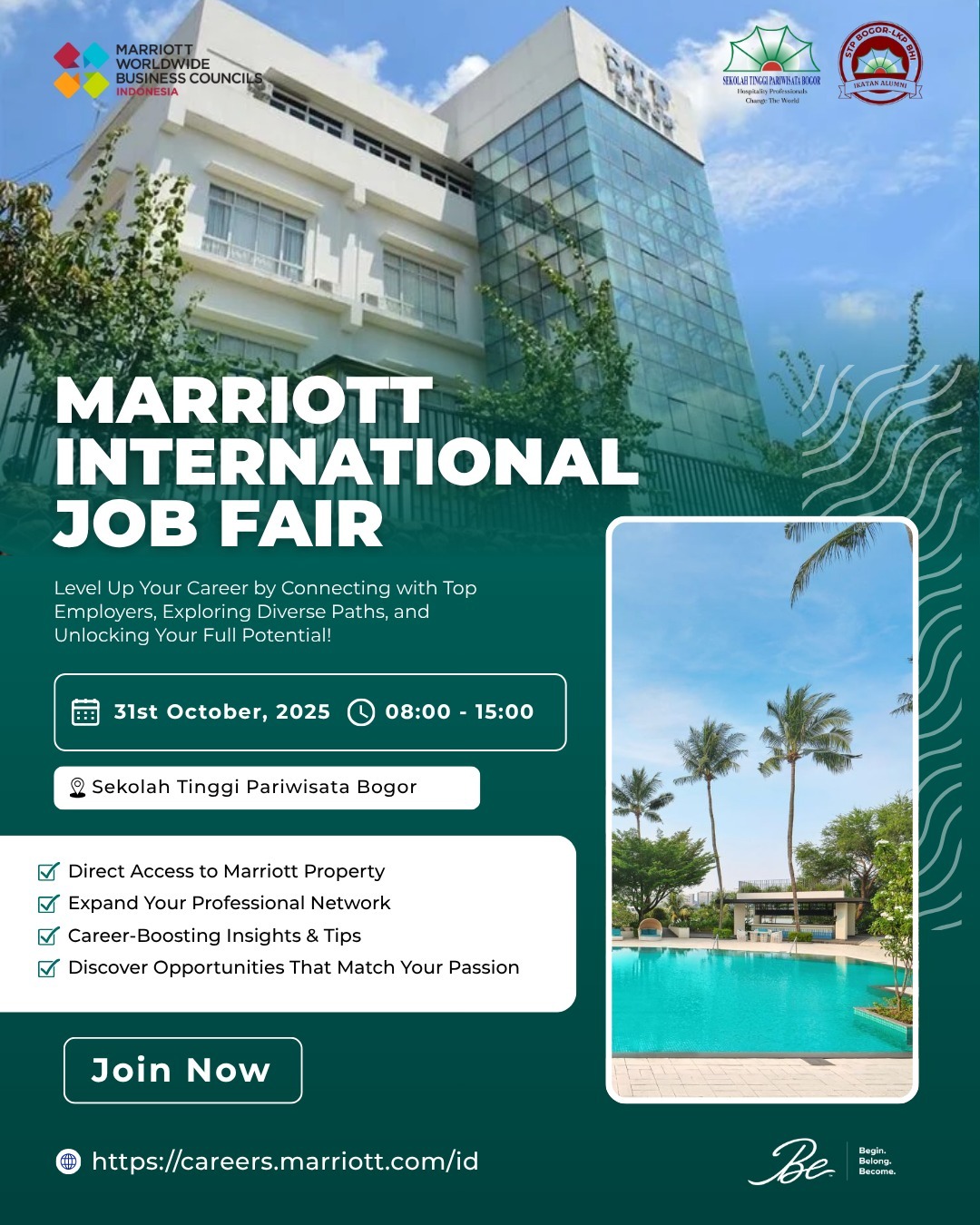 Koranpariwisata.com, Bogor – Sekolah Tinggi Pariwisata (STP) Bogor kembali menghadirkan gebrakan positif bagi para alumninya. Melalui kolaborasi antara Ikatan Alumni STP Bogor dan LKP BHI, kampus pariwisata ternama ini bekerja sama dengan Marriott International untuk menyelenggarakan kegiatan Job Fair & Recruitment Day, yang akan digelar pada Jumat, 31 Oktober 2025, pukul 08.00 – 15.00 WIB, bertempat di Kampus STP Bogor.
